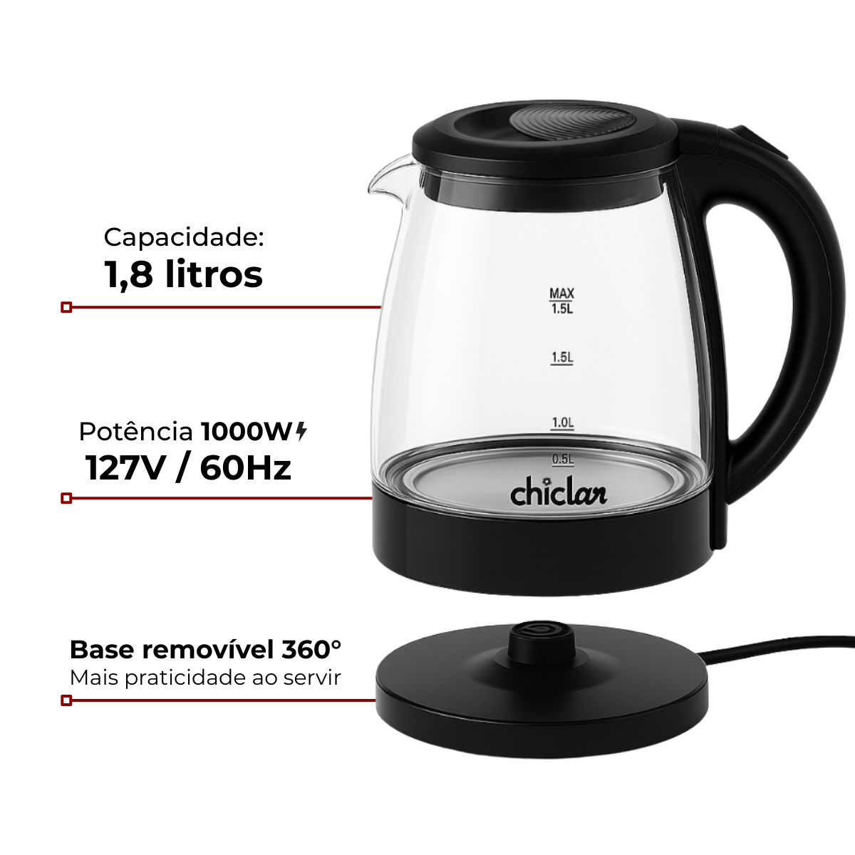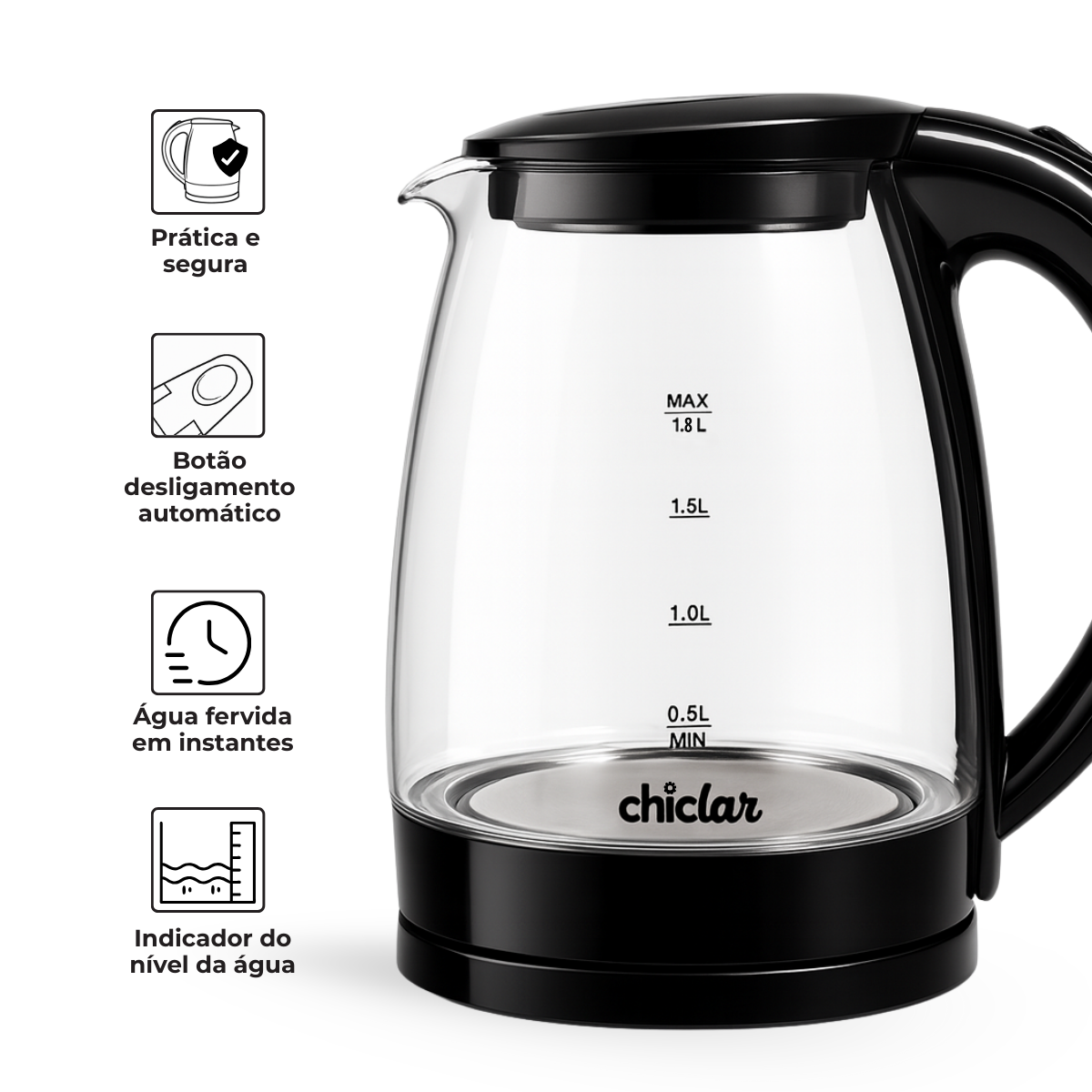 Chaleira Elétrica Glass Chic Lar 1,8L – Ferve Água em Segundos com Segurança e Estilo!