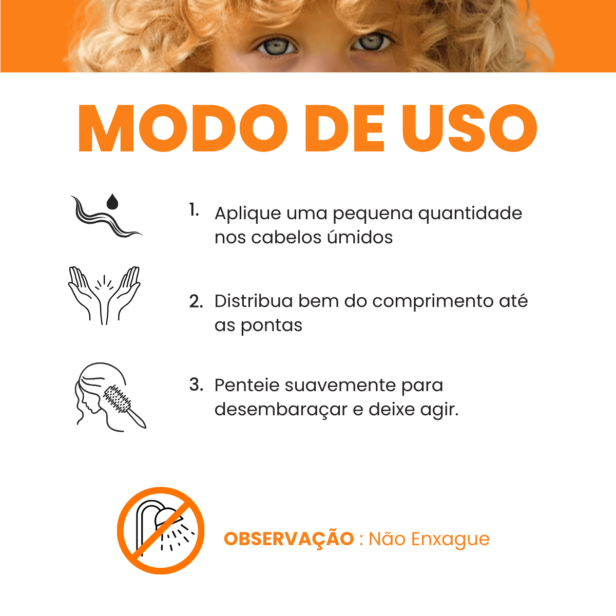 Modo de usar: aplique nos cabelos úmidos, espalhando bem do comprimento às pontas. Penteie suavemente para desembaraçar e deixe agir, sem enxaguar.