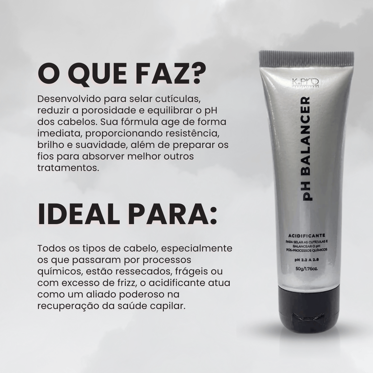 O K.Pro Acidificante Capilar Ph Balancer é um tratamento profissional em versão prática de 50g, desenvolvido para selar cutículas, reduzir a porosidade e equilibrar o pH dos cabelos. Sua fórmula age de forma imediata, proporcionando resistência, brilho e suavidade, além de preparar os fios para absorver melhor outros tratamentos.