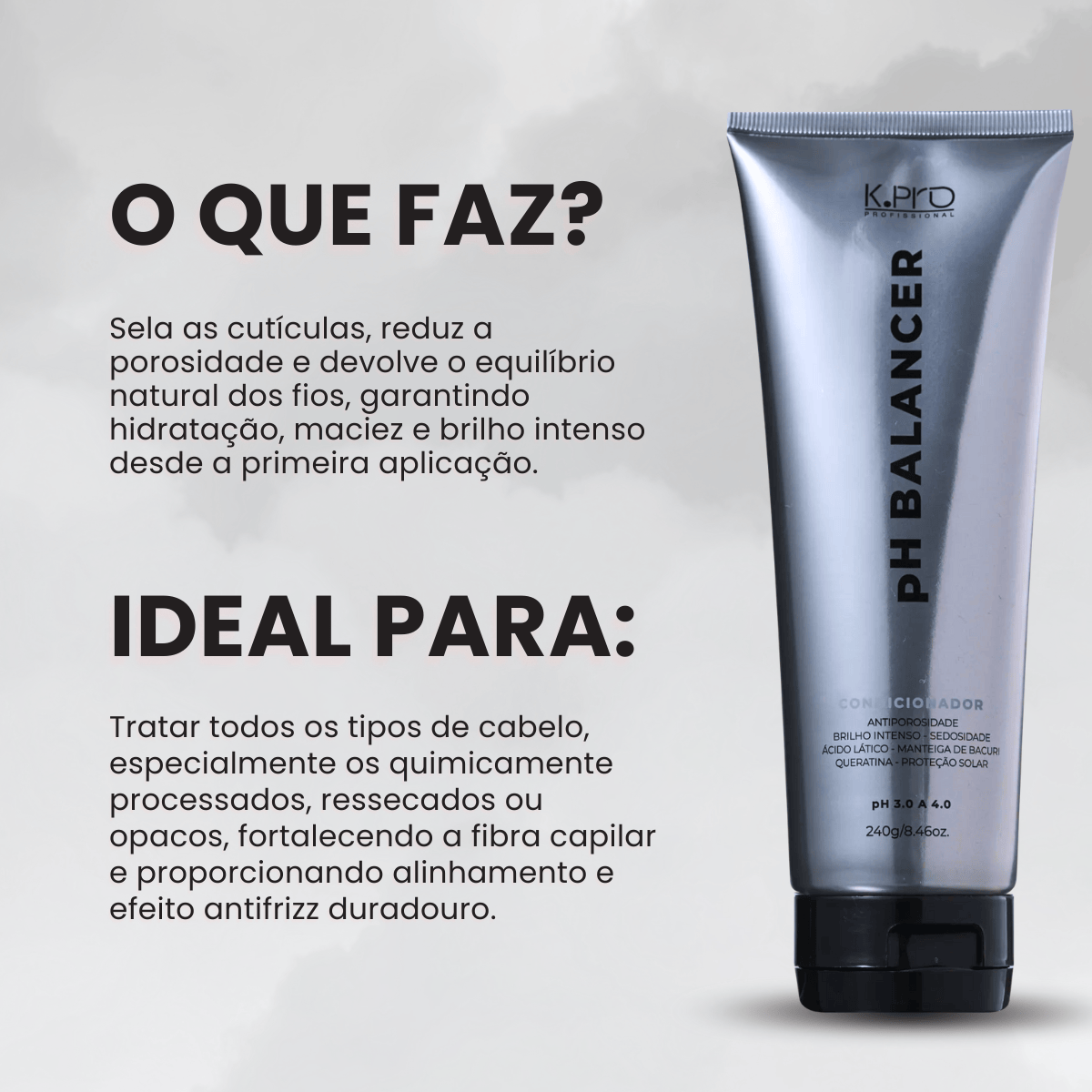 O K.Pro Ph Balancer Condicionador foi formulado para selar as cutículas, reduzir a porosidade e restaurar o equilíbrio natural do cabelo, garantindo maciez e luminosidade desde o primeiro uso. Sua ação antifrizz e antiporosidade proporciona um acabamento disciplinado, preservando a hidratação e fortalecendo a fibra capilar.