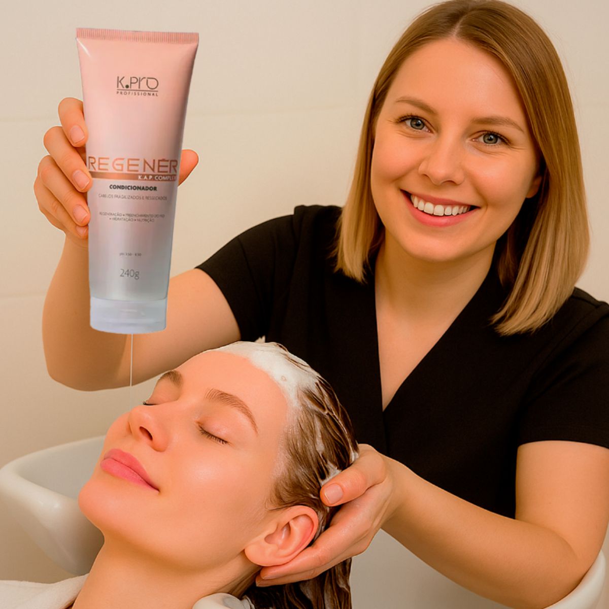 O K.Pro Regenér Condicionador foi desenvolvido para oferecer hidratação intensa, regeneração e preenchimento da fibra capilar, devolvendo saúde e vitalidade até aos cabelos mais danificados. Sua ação combina brilho, força e nutrição em uma fórmula leve e eficaz, indicada para todos os tipos de fios ¿¿¿ especialmente os que passaram por químicas, estão ressecados, opacos ou com frizz.