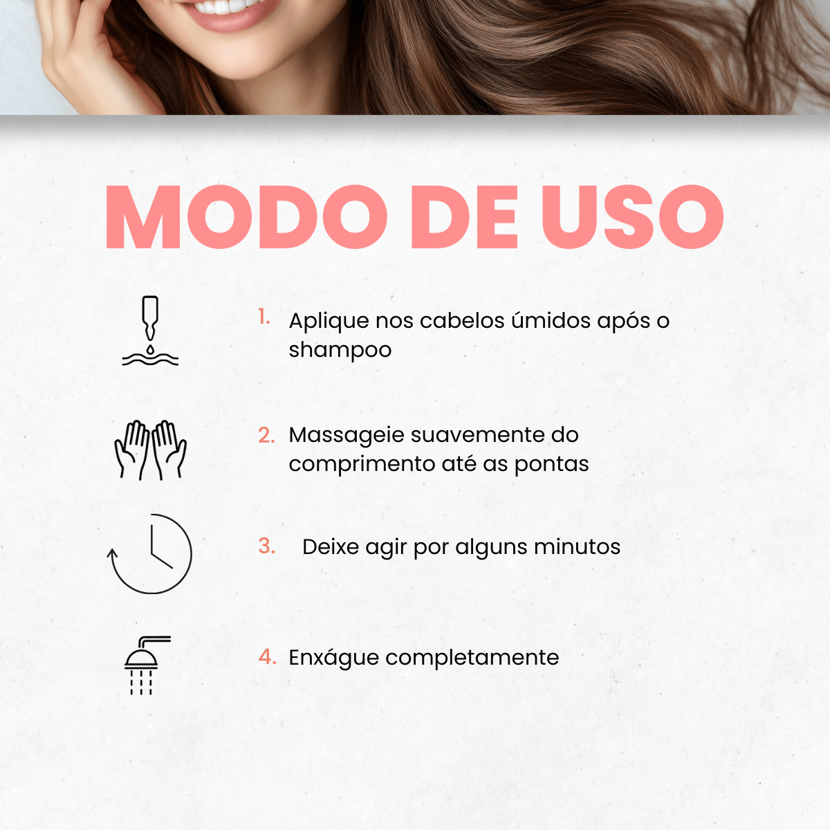Modo de usar: aplique nos cabelos úmidos após o shampoo, massageando suavemente do comprimento às pontas. Deixe agir por alguns minutos e enxágue bem.