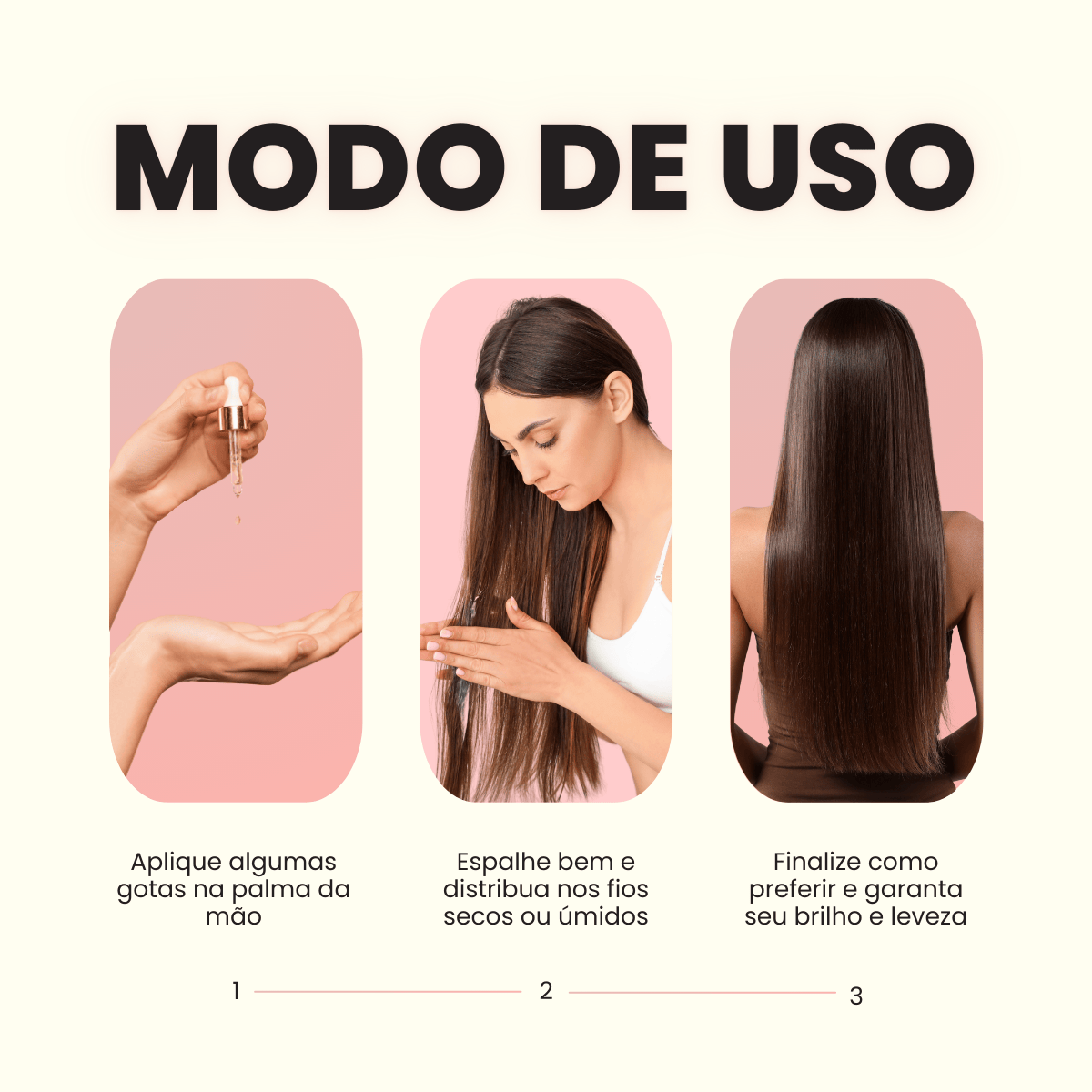 Modo de usar: aplique algumas gotas na palma da mão, espalhe bem e distribua nos fios secos ou úmidos. Finalize como preferir.