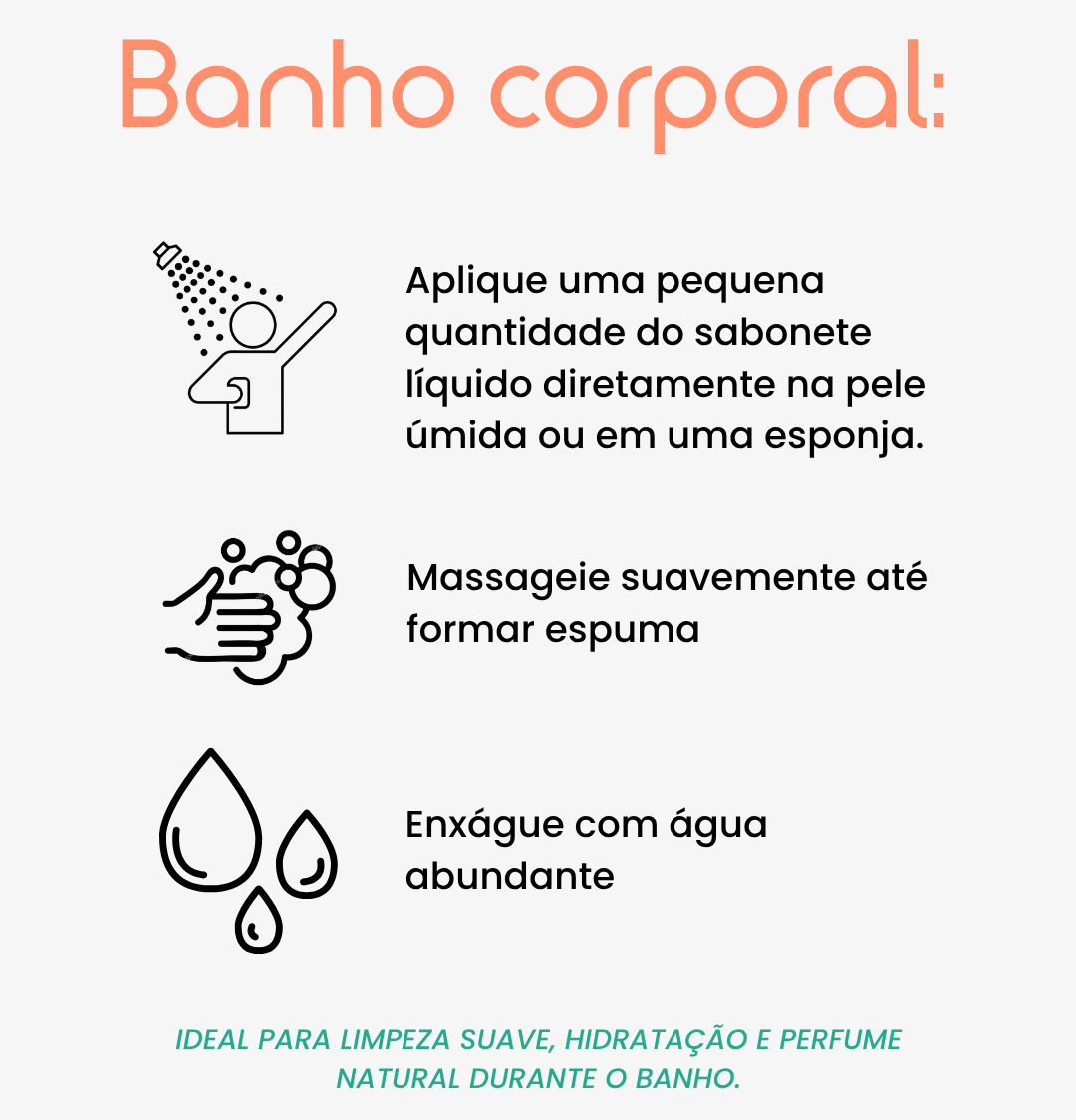 Aplique uma pequena quantidade do Sabonete Líquido Pitanga Vverd nas mãos ou em uma esponja, massageando suavemente sobre a pele úmida. Enxágue abundantemente. Para melhores resultados, utilize diariamente.